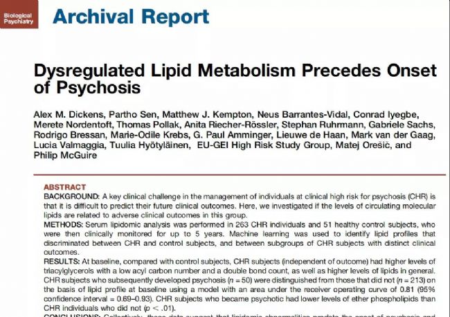 通過脂質(zhì)組學(xué)尋找有高風(fēng)險(xiǎn)精神病的人(CHR)最終會(huì)發(fā)展為精神病的預(yù)測(cè)biomarker。