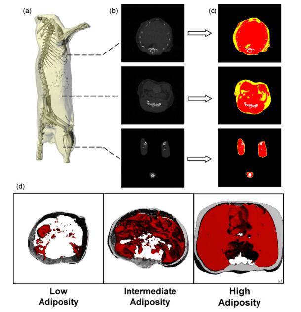 圖3.(a)小鼠的顯微CT三維重建圖,通過骨骼分布定義目標(biāo)區(qū)域。(b)對比發(fā)現(xiàn)小鼠大多數(shù)脂肪組織位于腹部區(qū)域,同時胸腔和腿部的低密度(脂肪)組織患病率較低。(c)為了量化這些不同體室中的脂肪量,將不同密度的組織分離并分類為脂肪(黃色)、瘦肉(紅色)或骨骼(白色)。(d)來自三只不同的低脂肪,中脂肪或高脂肪動物的代表性圖像。皮下脂肪顯示為灰色,內(nèi)臟脂肪顯示為紅色。
