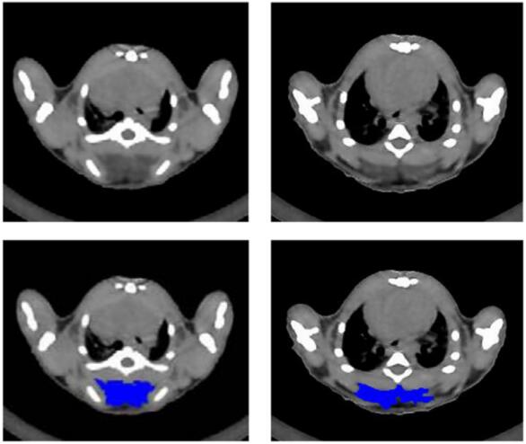 圖 4 小鼠肩胛部位橫截掃描圖。藍(lán)色代表棕色脂肪區(qū)域,左右為兩種不同形態(tài)的棕色脂肪。
