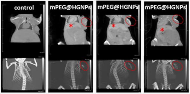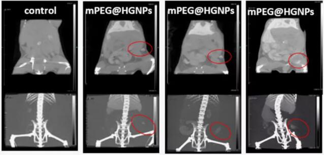 下圖為靜脈注射碘海醇,HGNP或mPEG@HGNP后0小時(shí),2小時(shí),4小時(shí)和12小時(shí)時(shí),異種移植荷瘤小鼠的體內(nèi)CT成像(上圖為二維圖像,下圖為三維圖像 )在注射后的不同時(shí)間點(diǎn)以0.6 nmol / g([Au或I])的相同劑量給藥(紅色星號(hào)表示肝臟,紅色圓圈表示腫瘤部位)。