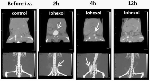 下圖為靜脈注射碘海醇,HGNPs或mPEG@HGNPs后0h,2h,4h和12h對(duì)原位荷瘤小鼠的體內(nèi)CT成像(上圖為二維圖像,下圖為三維圖像 ),在注射后的不同時(shí)間點(diǎn)使用相同劑量的0.6 nmol / g([Au或I])(白色箭頭表示膀胱,紅色圓圈表示腫瘤部位)。