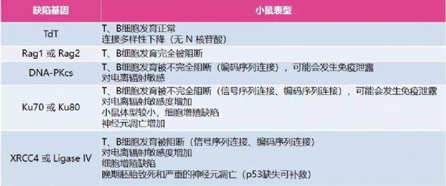 表1. 缺乏V(D)J重組所需蛋白質(zhì)的各種小鼠表型[4]