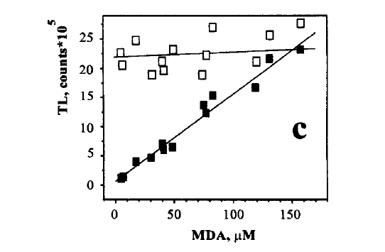 大量研究發(fā)現(xiàn):熱釋光測(cè)量能夠反映光合生物的脂質(zhì)過氧化水平。熱釋光強(qiáng)度會(huì)在120℃至140℃升溫過程產(chǎn)生特異性波峰。該波峰代表由三重態(tài)羰基及單線態(tài)氧引起的脂質(zhì)過氧化的水平,即波峰越高脂質(zhì)過氧化程度越高,并且波峰高低與其他脂質(zhì)過氧化檢測(cè)指標(biāo)存在相關(guān)關(guān)系。如下圖,熱釋光特征峰強(qiáng)度與MDA濃度呈現(xiàn)較強(qiáng)的線性相關(guān)性(黑色實(shí)心方形),引自1998年的《Photochemistry and Photobiology》,原文題目為《The Origin of 115-130°C Thermoluminescence Bands in Chlorophyll-Containing Material》。