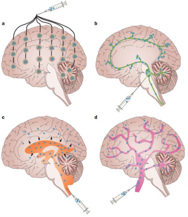 根據(jù)我們注射方式的不同,病毒病毒載體在中樞神經(jīng)系統(tǒng)中的傳遞模式和表達(dá)方式也不盡相同。使用立體定位儀注射模式大多數(shù)會(huì)產(chǎn)生垂直的孔,注射理想狀態(tài)是產(chǎn)生球型擴(kuò)散,實(shí)際情況由于操作精度及針頭停留時(shí)間的一個(gè)情況影響最后擴(kuò)散的模式往往是沿著注射孔徑分布。軸突注射模式主要沿軸突傳遞。腦室/脊髓注射模式則沿腔壁分布。血管注射模式會(huì)沿血管網(wǎng)分布。