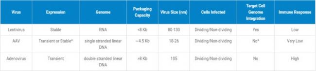◆ Lentivirus(慢病毒)中編碼為RNA,裝載序列容量小于8KB,產(chǎn)生的免疫反應(yīng)較低。