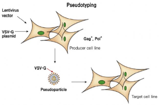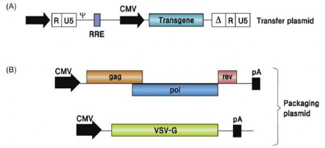 慢病毒是一種逆轉(zhuǎn)入病毒,它是RNA逆轉(zhuǎn)為雙鏈DNA整合到宿主細(xì)胞基因組。質(zhì)粒來源廣泛,主要來源于免疫缺陷病毒,比較常用的有HIV-1。慢病毒(Lentivirus)具有的一大特點(diǎn)是廣泛細(xì)胞感染能力,無論是神經(jīng)元、膠質(zhì)細(xì)胞、還是神經(jīng)干細(xì)胞均可感染,在Lentivirus包裝過程中它的膜蛋白VSV-G必須要放在包裝質(zhì)粒當(dāng)中,出于對(duì)Lentivirus生物安全性的考慮,我們把真正轉(zhuǎn)入的目標(biāo)外源基因的序列包裝在轉(zhuǎn)染質(zhì)粒上。具體可參考下圖: