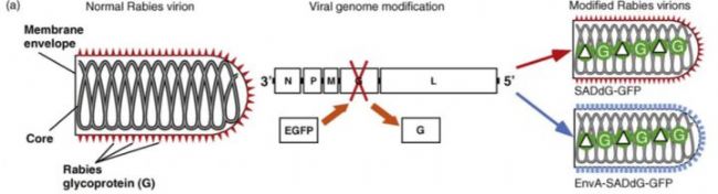 狂犬病毒不同于其它病毒載體,不可以作為廣普的病毒載體感染各類細(xì)胞。作為神經(jīng)科學(xué)研究的工具,狂犬病毒被應(yīng)用的點(diǎn)在于其神經(jīng)專嗜性(neurotropic viruses)。野生型狂犬病毒細(xì)胞內(nèi)高拷貝數(shù)具有細(xì)胞病毒,可逆行多級(jí)神經(jīng)元影響環(huán)路研究分析。產(chǎn)生移除糖蛋白G,重組SAD△G-GFP狂犬病毒不能逆行感染神經(jīng)元。后來通過產(chǎn)生引入外源膜蛋白EnVA重組EnVA-SAD△G-GFP特異感染表達(dá)受體TVA的細(xì)胞進(jìn)行感染。