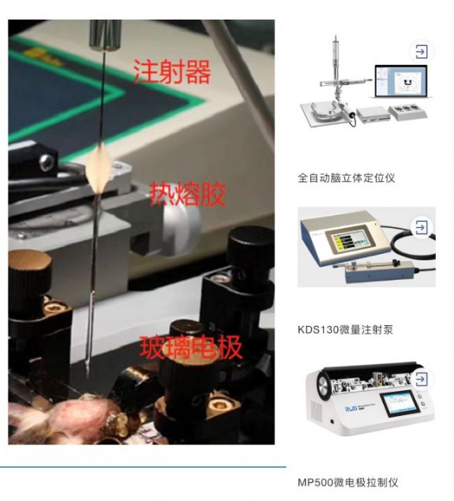 RWD71000全自動(dòng)腦立體定位儀、KDS LEGATO 130微量注射泵、Hamilton微量注射器及MP-500微電極拉制儀拉制出的電極來共同使用: