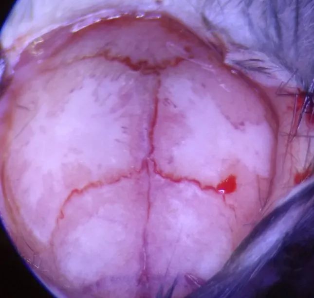 根據(jù)目標(biāo)腦區(qū)的立體定位圖譜坐標(biāo)進(jìn)行調(diào)整,用顱骨鉆鉆開小鼠顱骨,用針尖挑破硬腦膜。