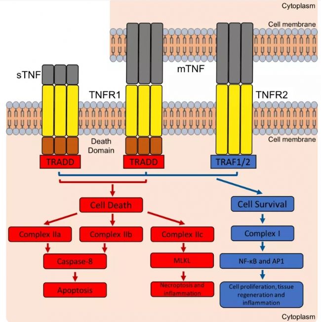 TNF-α有兩個(gè)受體:TNF receptor type 1 (TNFR1, 也稱為p55、CD120a) 和TNF receptor type 2 (TNFR2, 也稱為p75、CD120b)。其中,TNFR1持續(xù)性表達(dá)在幾乎所有有核細(xì)胞的表面;而TNFR2的表達(dá)范圍比較局限,主要是誘導(dǎo)性表達(dá)在一些免疫細(xì)胞(e.g. T細(xì)胞和巨噬細(xì)胞等)、神經(jīng)細(xì)胞,以及內(nèi)皮細(xì)胞中[1]。