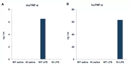 用生理鹽水 或LPS處理從野生型小鼠(n=2)和hTNF-α小鼠(n=2)收集的血漿樣品,通過(guò)ELISA測(cè)量mTNF-α(A)和hTNF-α(B)的平均濃度。