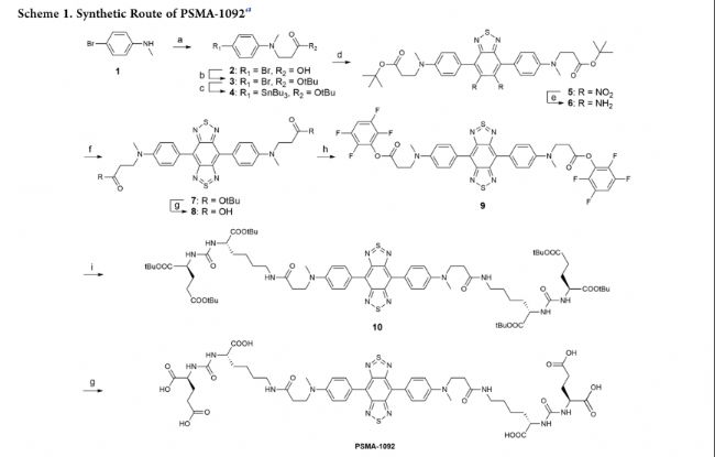 方案1:試劑和條件:(a)丙烯酸、乙酸(20% in H2O),100℃,隔夜,94.5%; (b)叔丁醇、DCC、DMAP、CH2Cl2,室溫,隔夜,43.2%;(c)六丁基二錫烷, Pd(PPh3)4,甲苯,N2, 120℃, 2 h;(d) 4,7-二溴-5,6-二硝基苯并[c][1,2,5]噻二唑,PdCl2(PPh3)2,甲苯,N2, 120℃,2 h, 7.7%;(e)鐵粉,醋酸,100℃,30分鐘,36.2%;(f) PhNSO, TMSCl,干吡啶,80°C,過(guò)夜,27.2%;(g) TFA, CH2Cl2,室溫,4 h, 100%;(h) 2,3,5,6-四氟苯酚,DCC, CH2Cl2,室溫,5 h, 67.4%;(i)二叔丁基(((S)-6-氨基-1-(叔丁基)-1-氧己基-2-基)氨基甲酰)- l –谷氨酸,Et3N, CH2Cl2,室溫,6 h, 61.3%。