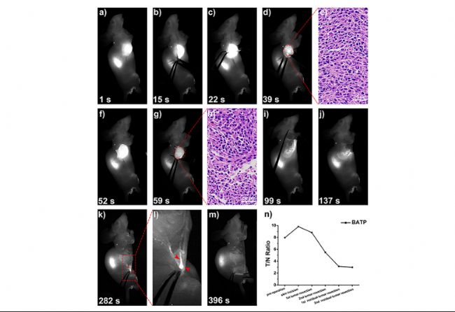 圖5:(a−d,f,g,i−m)術(shù)中NIR-II成像引導(dǎo)下腫瘤精確切除圖像。(e,h)兩個(gè)切除腫瘤的組織學(xué)研究。(n)沿手術(shù)方向TNR值。