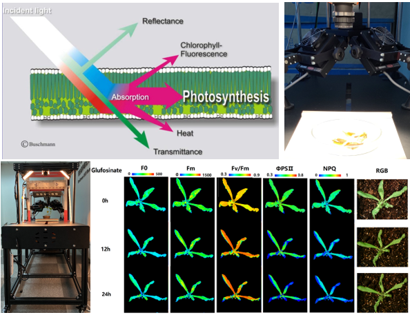 下左圖為PhenoTron PTS植物傳送至葉綠素?zé)晒獬上窈透吖庾V成像站(PhenoTron-HF)進(jìn)行成像分析;下右圖為草銨膦對(duì)擬南芥光合生理影響(葉綠素?zé)晒獬上穹治,由易科泰Ecolab實(shí)驗(yàn)室提供)