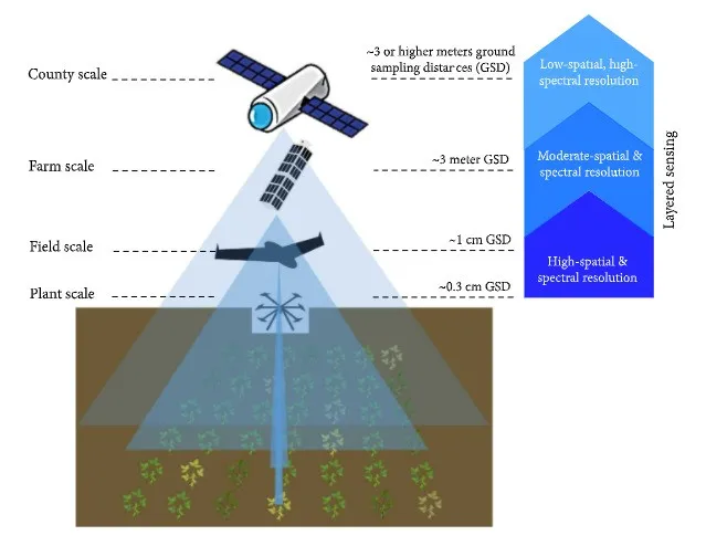 Figure 1: UAS across phenotyping scales, sensing levels, and ground sampling distance (GSD). Image is for illustration purposes and not to scale.