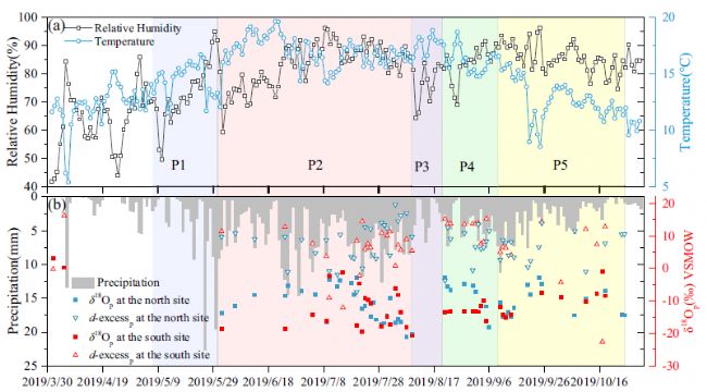 程海湖流域地表2 m以上的δ18Op(實(shí)心正方形),d-excessp(空心三角形)和氣象參數(shù),包括相對(duì)濕度(黑色)、氣溫(藍(lán)色)(a)和降水量(b)的時(shí)間特征。根據(jù)降水同位素值,降水量和氣象因素(降水、相對(duì)濕度和溫度)的變化趨勢(shì),劃分為P1-P5期。