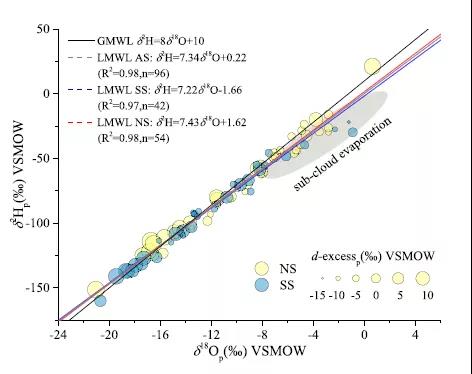 降水δ18Op和δ2Hp日散點(diǎn)圖和線性擬合的地區(qū)大氣降水線(LMWLs)。氣泡大小表示不同d-excess值;疑珯E圓區(qū)域受云下二次蒸發(fā)的影響。