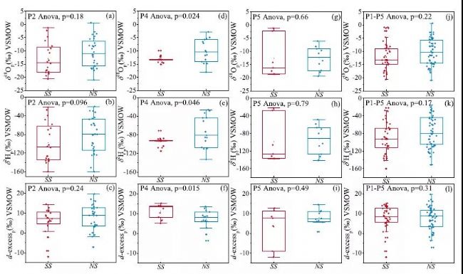 箱形圖顯示了P2(a-c)、P4(d-f)、P5(g-i)和整個(gè)P1-P5(j-l)時(shí)期南岸(SS)和北岸(NS)降水的δ18Op、δ2Hp和d-excessp分布。