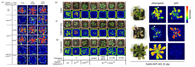 eIF4E1等位基因獲得病毒抗性、利用CRISPR-Cas9 base editing基因編輯技術模仿eIF4E自然多態(tài)性與病毒抗性的關系、擬南芥敲除eIF4E1獲得ClYVV抗性但又與TuMV的敏感性相關等。這些研究中,F(xiàn)luorCam熒光成像技術提供了關鍵的GFP活體成像圖,定量分析感染面積與病毒積累量,從而直觀地反映了不同基因功能對擬南芥病毒抗性的影響。同時,葉綠素熒光成像則反映病毒對光合系統(tǒng)的損傷,可以同步提供植物的光合表型信息。