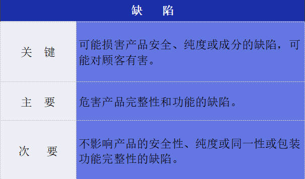 沒有通用規(guī)則,美國國家標(biāo)準(zhǔn)協(xié)會(ANSI/ASQ Z1.4-2008標(biāo)準(zhǔn))根據(jù)包裝缺陷對產(chǎn)品質(zhì)量屬性的關(guān)鍵影響,提出了包裝缺陷的檢驗分類。根據(jù)下圖標(biāo)準(zhǔn),關(guān)鍵和主要缺陷應(yīng)該是不合格和拒收,而次要缺陷是符合和可以接受的。