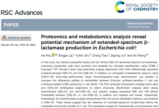 在本研究中,應(yīng)用TMT蛋白質(zhì)組學(xué)和代謝組學(xué)的聯(lián)合分析來比較β-內(nèi)酰胺類抗生素敏感大腸桿菌和產(chǎn)超廣譜β-內(nèi)酰胺酶大腸桿菌(ESBL-EC)菌株之間蛋白質(zhì)和代謝物的差異,結(jié)果表明超廣譜β-內(nèi)酰胺酶的存在影響大腸桿菌的代謝物和蛋白質(zhì)譜,差異蛋白和差異代謝物可能在ESBL-EC的抗生素耐藥性中起重要作用。該研究可以在代謝物和蛋白質(zhì)水平上為ESBL-EC抗生素耐藥性的機制研究提供科學(xué)數(shù)據(jù),針對這些途徑的調(diào)節(jié)劑可能對ESBL-EC菌株的治療有效并揭示臨床大腸桿菌菌株的抗生素抗性機制。