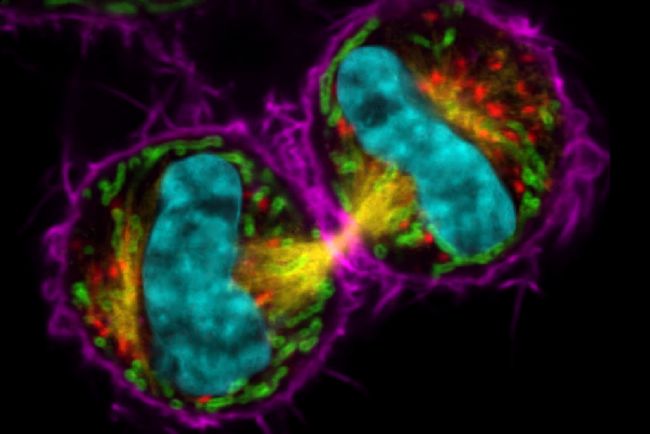 COS7有絲分裂細胞。染色質(青色,mCherry),有絲分裂紡錘體(黃色,EGFP),高爾基體(紅色,Atto647N),線粒體(綠色,AF532),肌動蛋白絲(紫色,SiR700)。樣本由蘇黎世大學的Jana Döhner和Urs Ziegler提供;表達mCherry的細胞由Daniel Gehrlich贈送。SiR由Spirochrome贈送。