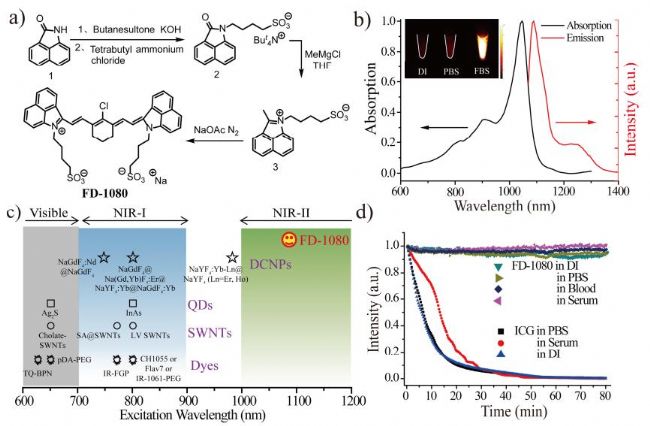 圖1:a) FD-1080的合成路徑; b) FD-1080的激發(fā)與發(fā)射圖譜; c) 現(xiàn)有的NIR-II染料激發(fā)波長(zhǎng)示意圖; d) FD-1080與ICG(吲哚菁綠)分別在1064 nm和808 nm(0.33 W·cm-2)波長(zhǎng)下的光穩(wěn)定性
