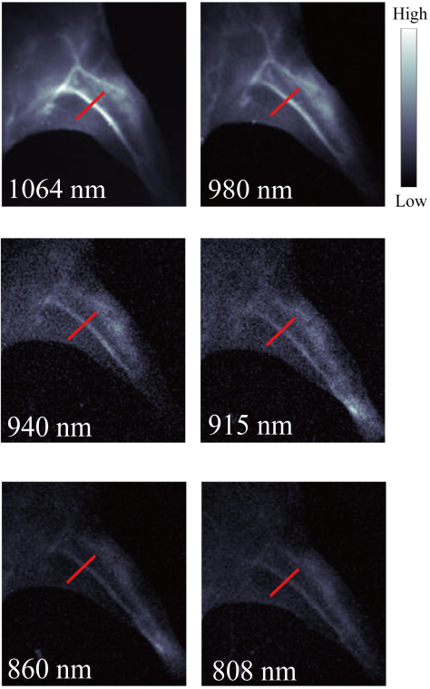 圖2:FD-1080在不同激發(fā)波長(zhǎng)下的小鼠后肢血管成像效果(1300 nm長(zhǎng)通濾光片)