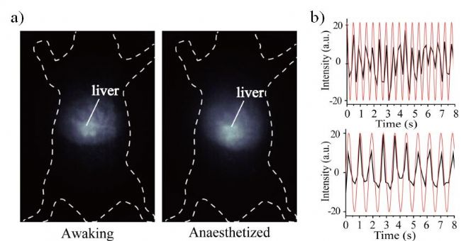 圖4:a) 小鼠清醒時(shí)(左)與麻醉后(右)的肝臟成像及b) 相應(yīng)的呼吸速率