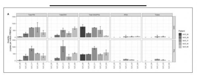 ☑ 使用naica®微滴芯片數(shù)字PCR系統(tǒng)直接定量來自HIV-1患者的五個PBMC樣本,這些樣本病毒載量較低,且均經(jīng)過ART治療,檢測結(jié)果顯示5個患者均檢出了HIV-1。此外,發(fā)現(xiàn)一個比較有趣的現(xiàn)象,在患者SLR_26樣本中幾乎沒有檢測到ENV且PSI也只有非常低的信號,該結(jié)果表明PSI和ENV序列中可能存在缺失或突變,如果只檢測這兩個靶點的話,該病人可能被判讀為HIV-1陰性。幸運的是,使用naica®微滴芯片數(shù)字PCR系統(tǒng)設(shè)計的三重實驗,GAG或POL基因正常檢出,表明該樣本含有HIV-1。