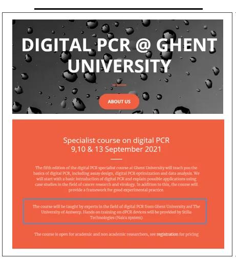 隨著數(shù)字PCR技術(shù)的發(fā)展,根特大學(xué)已成立數(shù)字PCR聯(lián)盟,該聯(lián)盟致力于開發(fā)數(shù)字PCR檢測和數(shù)據(jù)分析工具,同時該平臺還會不定期舉辦數(shù)字PCR培訓(xùn)課程,幫助廣大學(xué)子及專業(yè)人士更好的了解和應(yīng)用數(shù)字PCR技術(shù)。