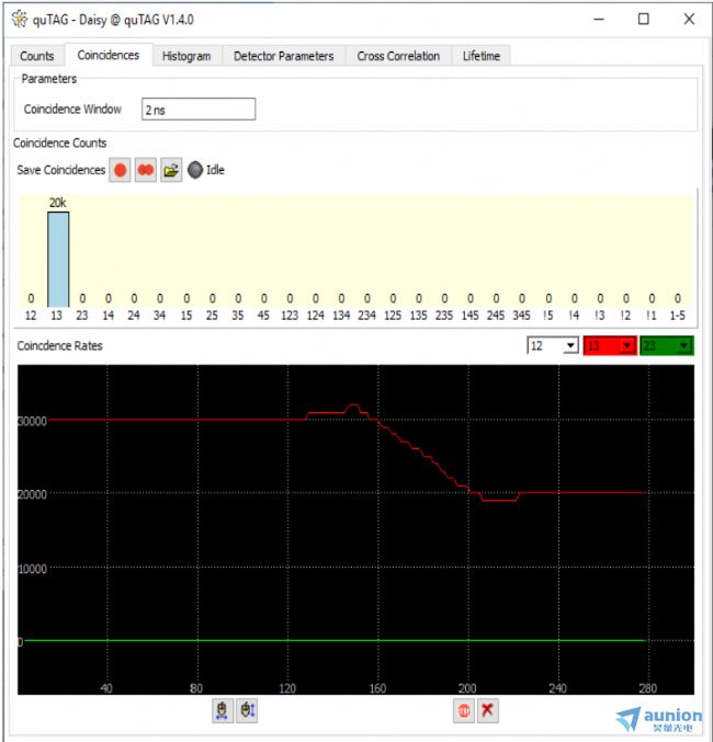 5、在Coincidence標(biāo)簽界面如下圖,在此界面與Counts界面的顯示類似;如果沒有設(shè)置合適的Coincidence Window也不會出現(xiàn)計數(shù)值的;同樣的,在此界面也可以保存每個符合通道的計數(shù)值。