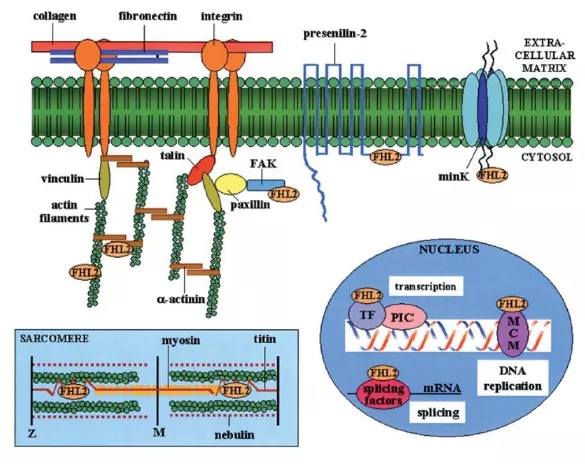 1. Johannessen M, Møller S, Hansen T, Moens U, Van Ghelue M. The multifunctional roles of the four-and-a-half-LIM only protein FHL2. Cell Mol Life Sci. 2006 Feb;63(3):268-84. doi:10.1007/s00018-005-5438-z. PMID: 16389449.