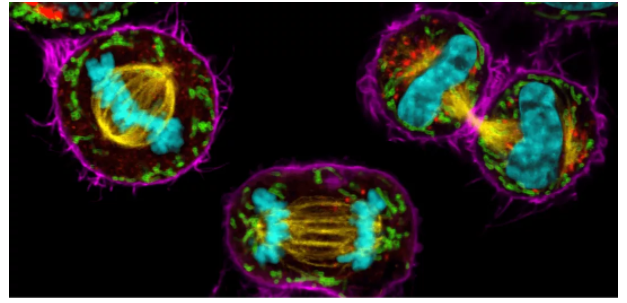 圖1 COS7有絲分裂細胞。染色質(zhì)(青色,mCherry),有絲分裂紡錘體(黃色,EGFP),高爾基體(紅色,Atto647N),線粒體(綠色,AF532),肌動蛋白絲(紫色,SiR700)。樣片提供:蘇黎世大學Jana Döhner和Urs Ziegler。