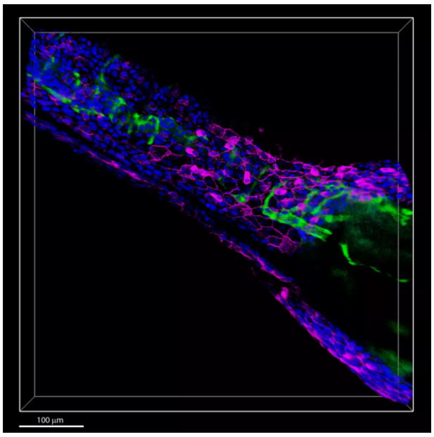 圖2 斑馬魚胚胎。用STELLARIS 8獲得3D圖像,細胞核:藍色,Hoechst;內(nèi)皮細胞:綠色,EGFP;細胞膜:紫色,NIR750。樣本由法國斯特拉斯堡的IGBMC的Julien Vermot提供。
