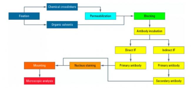 固定是IF程序的第一步。其目的是保持細胞、細胞結(jié)構(gòu)或組織處于其當前狀態(tài),并通過化學試劑長期保存。在固定過程中,重要的是細胞結(jié)構(gòu)盡可能保持其原有的構(gòu)象。不同的固定方法對IF有用,每種試劑對一抗表位有不同的影響?贵w結(jié)合位點可能被掩蓋或被固定所破壞,這會損害IF染色質(zhì)量。由于每種抗體以不同的方式與抗原結(jié)合依賴于不同的固定化合物,因此有必要嘗試幾種新抗體的固定方法。