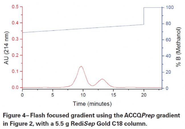 僅使用來(lái)自用于評(píng)估樣品純度的篩選運(yùn)行的數(shù)據(jù),和使用ACCQPrep 內(nèi)置的聚焦梯度生成器允許在 12min內(nèi)確定優(yōu)化閃式色譜的方法,該工具還允許用戶(hù)提前確定在快速色譜柱上運(yùn)行目標(biāo)化合物和最近的雜質(zhì)之間是否有足夠的分離度,或者如果需要更高的分離度,ACCQPrep 是否為必需的;在給定的分離度下,ACCQPrep 計(jì)算的梯度可以用于閃式快速純化;或繼續(xù)運(yùn)行ACCQPrep。