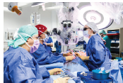 圖片: Christine Bach博士使用手術(shù)顯微鏡實施頜面外科整形與重建手術(shù)。Bach博士和她的助理都坐著進行手術(shù)。