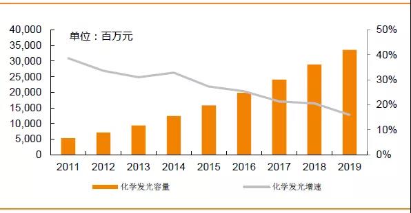 中國化學發(fā)光市場在2019年為300-350億,行業(yè)增速約為15-20%, 而且從2011年到2019年均保持較高增速,市場前景廣闊。