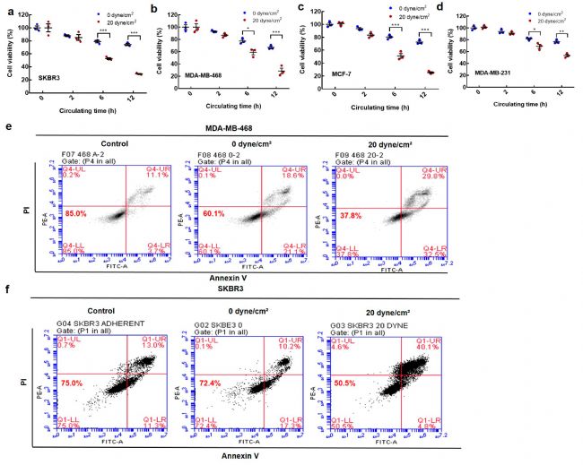 為了探討流體剪切應(yīng)力對(duì)懸浮腫瘤細(xì)胞活性的影響,不同惡性程度的乳腺癌細(xì)胞在不同水平的剪切應(yīng)力下循環(huán)不同的時(shí)間。結(jié)果表明,在一定剪切應(yīng)力下,懸浮CTCs 的活性隨循環(huán)時(shí)間的延長(zhǎng)而逐漸降低(圖2 a-d)。在不同時(shí)間點(diǎn),20 dynes/cm2切應(yīng)力下的細(xì)胞存活率明顯低于0 dynes/cm2切應(yīng)力下的細(xì)胞存活率。Annexin V分析進(jìn)一步證實(shí)了這些發(fā)現(xiàn)(圖2 e、f)。在四種乳腺癌細(xì)胞系中也觀察到類似的現(xiàn)象(SKBR3、MCF-7、MDA-MB-468 和 MDA-MB-231;圖2)。這些結(jié)果表明,流體剪切應(yīng)力消除了大部分懸浮的 CTCs。