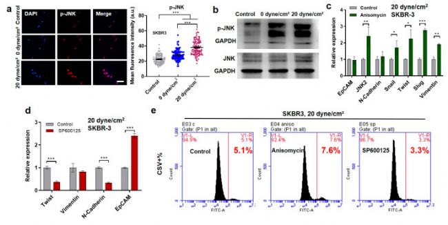 其次,為了檢測(cè)流體剪切應(yīng)力可能通過(guò)JNK信號(hào)通路誘導(dǎo)EMT表型這個(gè)假設(shè),研究人員在剪切應(yīng)力處理后檢測(cè)了 JNK 信號(hào)通路的活性。結(jié)果表明,在SKBR3、MDA-MB-468和MCF-7等多種乳腺癌細(xì)胞中,20 dyne/cm2剪切應(yīng)力處理后,CTCs中JNK信號(hào)的磷酸化水平高于0 dyne/cm2的剪切應(yīng)力處理(圖3 a和圖4 a、c)。免疫印跡進(jìn)一步證實(shí)了JNK信號(hào)的激活,而JNK的總水平在對(duì)照細(xì)胞和剪切處理細(xì)胞之間無(wú)明顯差異(圖3 b)。