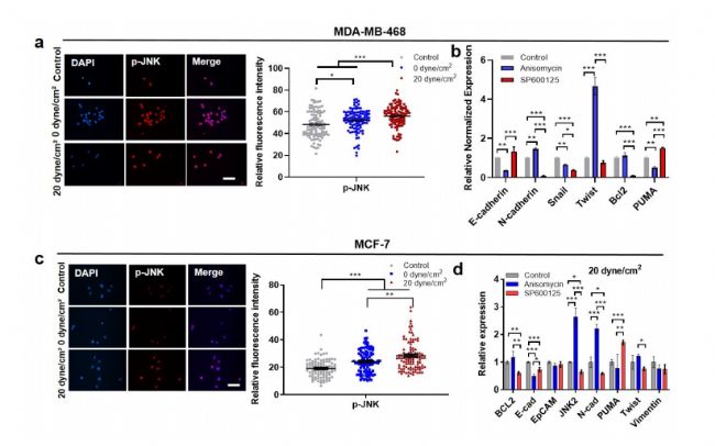 為了探討在剪切誘導(dǎo)的 EMT 中的作用,當(dāng)乳腺癌細(xì)胞暴露于流體剪切應(yīng)力時(shí),JNK 信號(hào)通路被調(diào)節(jié)。茴香霉素,一種 JNK 激活劑,在 20 dyne/cm2 剪切應(yīng)力的存在下,顯著上調(diào)間充質(zhì)標(biāo)志物的表達(dá),并促進(jìn)懸浮腫瘤細(xì)胞的 EMT 表型(圖3 c 和圖4 b、d)。