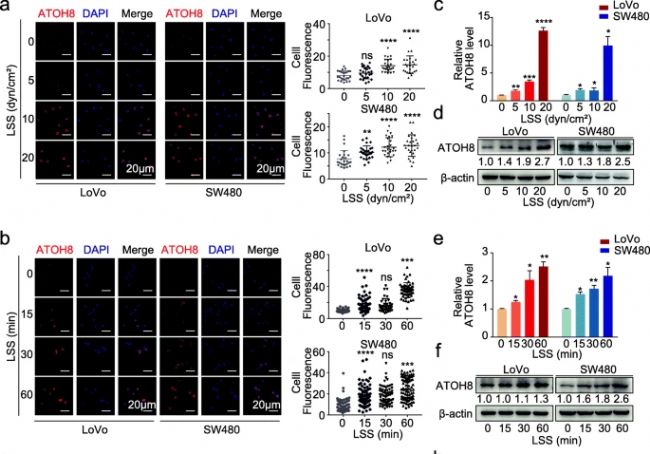 機械轉(zhuǎn)導(dǎo)分子具有感知和轉(zhuǎn)換各種機械力的能力,可以將物理刺激轉(zhuǎn)化為生物信號。據(jù)報道,作為一種新的 LSS 反應(yīng)分子,無調(diào)性 bHLH 轉(zhuǎn)錄因子 8 (ATOH8)在內(nèi)皮細胞中由 10 dyn/cm2 的LSS 誘導(dǎo)。此外,ATOH8還參與了多個生物學(xué)過程的機械因素調(diào)控,包括血管生成、骨骼肌形成和胚胎發(fā)育。在以往的研究中,ATOH8在腫瘤中的表達具有異質(zhì)性,其作為抑癌基因或促癌基因的作用仍存在爭議。簡而言之,ATOH8 的作用及其在 CRC 進展中感知 LSS 的能力值得進一步研究。