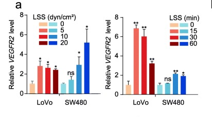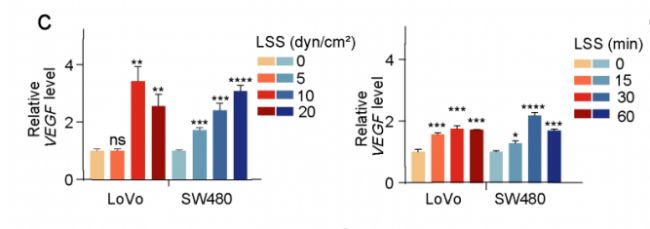 因此,實驗研究了 CRC 細胞中的細胞因子和細胞因子受體的水平,發(fā)現(xiàn) LSS 顯著上調(diào)了VEGF。與ATOH8一致,通過LSS施加強度和持續(xù)時間的逐漸增加,在兩種CRC m-CTCs 中均觀察到VEGF的上調(diào)和其分泌的增加(圖3 b-e;圖4)。值得注意的是,以往文獻表明,當人脫落的乳牙暴露于4 dyn /cm2的剪切應(yīng)力約4h時,VEGF分泌逐漸達到平臺期,這與CRC m-CTCs中ATOH8 mRNA的變化趨勢相似。