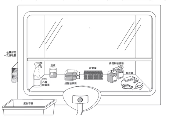 ① 在工作臺(tái)中部開闊區(qū)域放置細(xì)胞培養(yǎng)容器;