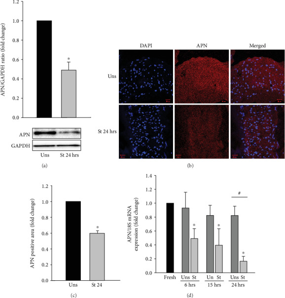 為了檢測響應(yīng)機械拉伸的細(xì)胞內(nèi) APN 水平的降低是否發(fā)生在轉(zhuǎn)錄水平,進(jìn)行實時 PCR 分析以檢測拉伸對 VSMCs 中 APN mRNA 表達(dá)的影響。RPVs 被機械拉伸 6、15 或 24 小時,并將它們的 APN mRNA 表達(dá)水平與未拉伸的RPVs 和新鮮 RPVs 進(jìn)行比較。如圖1(d)所示,與新鮮 RPVs 相比,機械拉伸 6 小時導(dǎo)致 APN mRNA 表達(dá)顯著下降。與新鮮和未拉伸 24 小時的RPVs相比,拉伸 15 小時導(dǎo)致 APN mRNA 表達(dá)更明顯和顯著的下降,而機械拉伸 RPV 24 小時導(dǎo)致 APN mRNA 表達(dá)更加明顯的下降(圖1 d)。