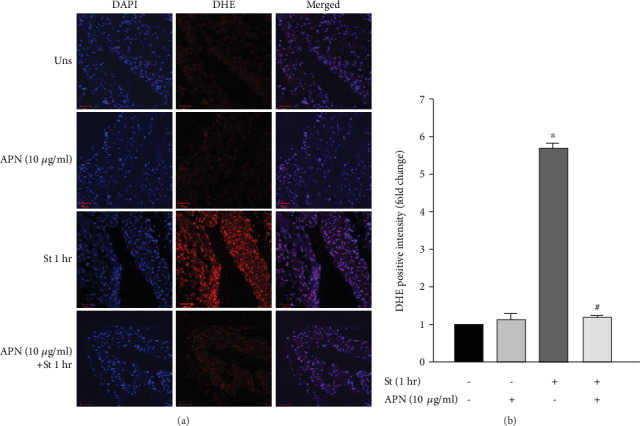 機械拉伸會增加 ROS,進(jìn)而促進(jìn)血管重塑并誘導(dǎo)肥大。為了研究 APN 對 VSMCs 中拉伸誘導(dǎo)的 ROS 產(chǎn)生的影響,將 RPVs 拉伸 1 小時并用 APN (10 μg/ml) 處理,并使用 DHE 檢測 ROS。如圖3所示,用 APN (10 μ g/ml)處理的未拉伸 RPVs 在 ROS 產(chǎn)生方面沒有表現(xiàn)出任何顯著變化。1 小時后機械拉伸顯著增加了 ROS 的產(chǎn)生,而用10 μg/ml APN處理拉伸的 RPVs 顯著降低了 ROS 的產(chǎn)生(圖3 a、b)),表明 APN 在機械拉伸過程中對 VSMCs 的抗肥大作用可能是通過減少ROS的產(chǎn)生介導(dǎo)的。