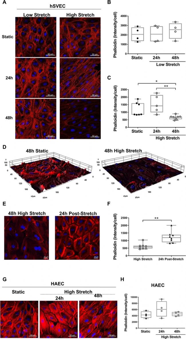 在 LS 下培養(yǎng)的 hSVECs 顯示與靜態(tài)條件相似的皮質(zhì)F-肌動(dòng)蛋白的模式和強(qiáng)度(圖2 A、B)。相比之下,24 小時(shí) HS 導(dǎo)致肌動(dòng)蛋白應(yīng)力纖維的顯著形成(圖2 A),48 小時(shí)后 F-肌動(dòng)蛋白染色明顯減少(圖2 A、C)。z-stack 切片的3D重建證實(shí)了整個(gè)細(xì)胞中F-肌動(dòng)蛋白體積的減少(圖 2 D)。這種現(xiàn)象是可逆的,細(xì)胞在靜態(tài)條件下放置24小時(shí)后,肌動(dòng)蛋白應(yīng)力纖維將會(huì)重新出現(xiàn)(圖2 E、F)。F-肌動(dòng)蛋白減少僅在 hSVECs 中觀察到;無論拉伸條件如何,人主動(dòng)脈內(nèi)皮細(xì)胞(HAECs )均未顯示肌動(dòng)蛋白纖維結(jié)構(gòu)的變化(圖 2 G、H)。