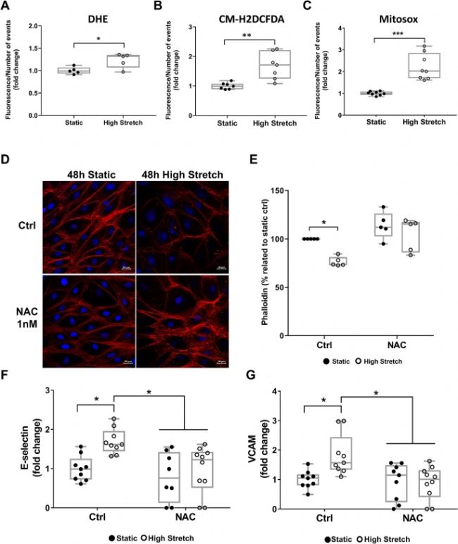 最終實(shí)驗(yàn)結(jié)果表明,體外 HS 降低了 NO 生物利用度,增加了炎癥粘附分子(E-選擇素和 VCAM1)的表達(dá)和 THP-1 細(xì)胞的粘附。HS 降低 hSVECs 中的 F-肌動(dòng)蛋白,但不會(huì)降低人動(dòng)脈內(nèi)皮細(xì)胞中的 F-肌動(dòng)蛋白,并且伴隨著 G-肌動(dòng)蛋白和肌動(dòng)蛋白素的核穿梭以及活性氧 (ROS) 的增加。用抗氧化劑 N-乙酰半胱氨酸 (NAC) 進(jìn)行預(yù)處理支持這一觀察結(jié)果,并減少了拉伸誘導(dǎo)的肌動(dòng)蛋白重塑和炎癥粘附分子的表達(dá)。