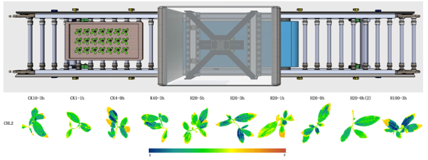 由傳送帶和光譜成像站組成,包括高光譜成像站、葉綠素?zé)晒馀c多光譜熒光成像站等,用于植物表型組學(xué)、生理生態(tài)學(xué)、遺傳育種、抗性篩選、種質(zhì)資源研究檢測等。下圖為茶苗抗凍性高光譜成像分析(易科泰光譜成像與無人機遙感研究中心提供)。